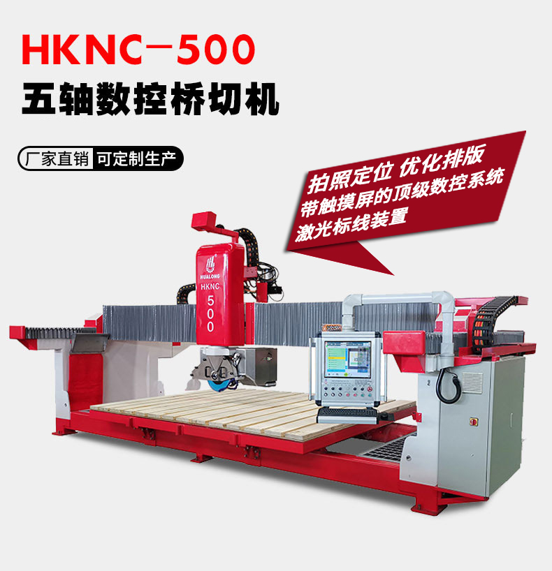 橋式石材切割機(jī)HKNC-500,配備意大利數(shù)控系統(tǒng)ESA和5軸插補(bǔ),適用于切割各種尺寸的石板,如花崗巖、大理石、石英巖和人造石板等。它結(jié)合了雕刻的功能、銑、切、鉆、雕一體進(jìn)行復(fù)雜臺面加工。